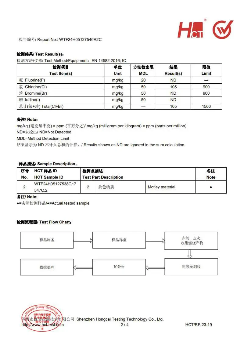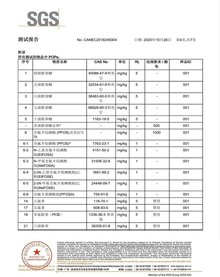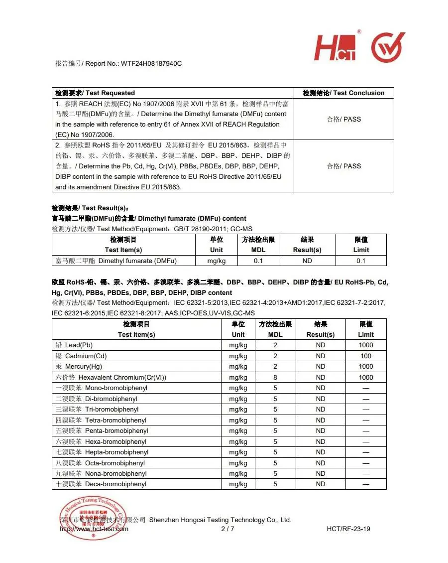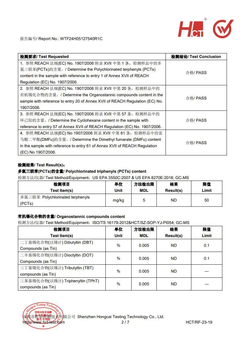 - 原材料安全:符合富马酸二甲酯(DMFu)、邻苯二甲酸酯、多环芳烃(PAHs)和卤素等有害物质的限制要求。