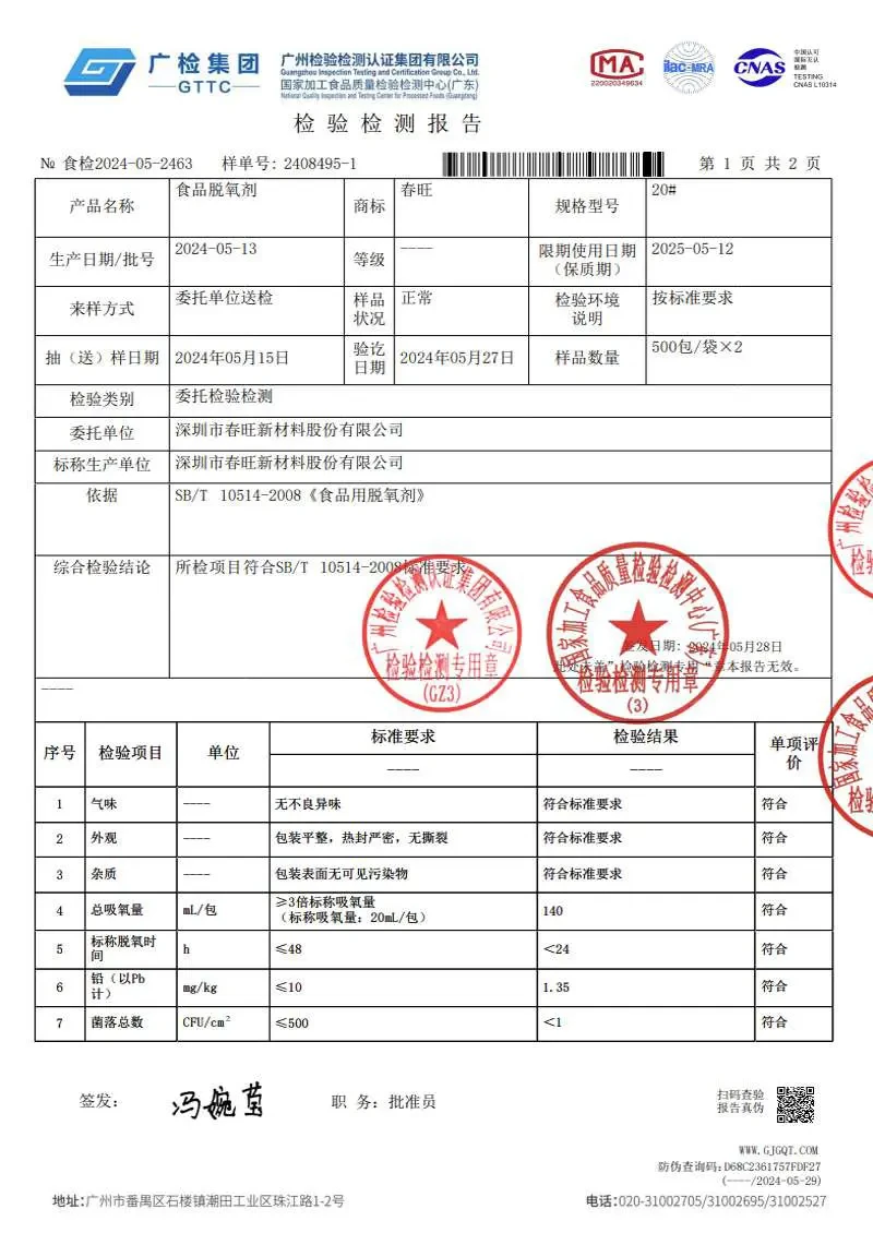 迄今为止,公司已成功申请多项实用新型和外观设计专利,涵盖核心技术、产品设计以及工艺突破。通过专利申请,春旺有效地保护了原始创新成果,防止技术抄袭,构建了长期竞争壁垒,在行业内树立了显著影响力,并参与了多项国家现行标准的制定,包括《包装用干燥剂》(BB/T 0049-2021)、《食品用干燥剂质量要求》(GB/T 41897-2022)和《食品用脱氧剂质量要求》(GB/T 41896-2022)。
