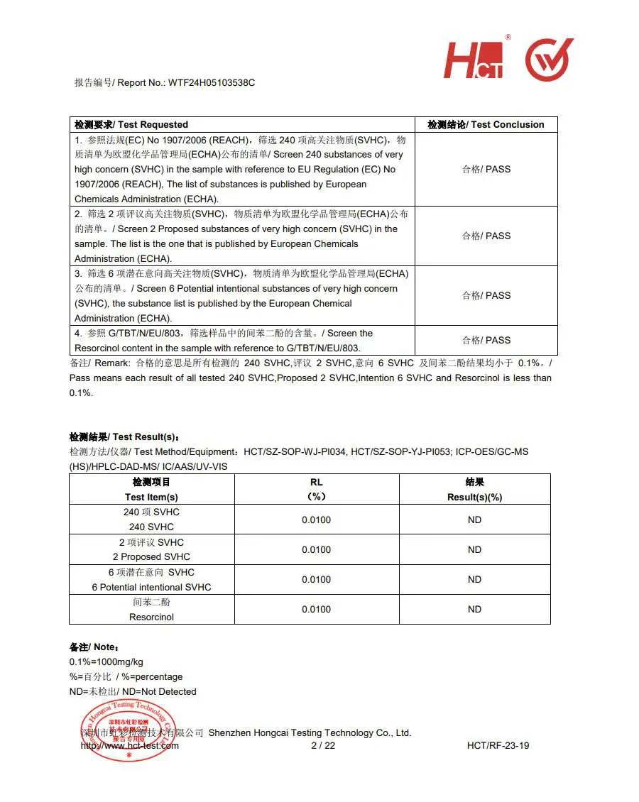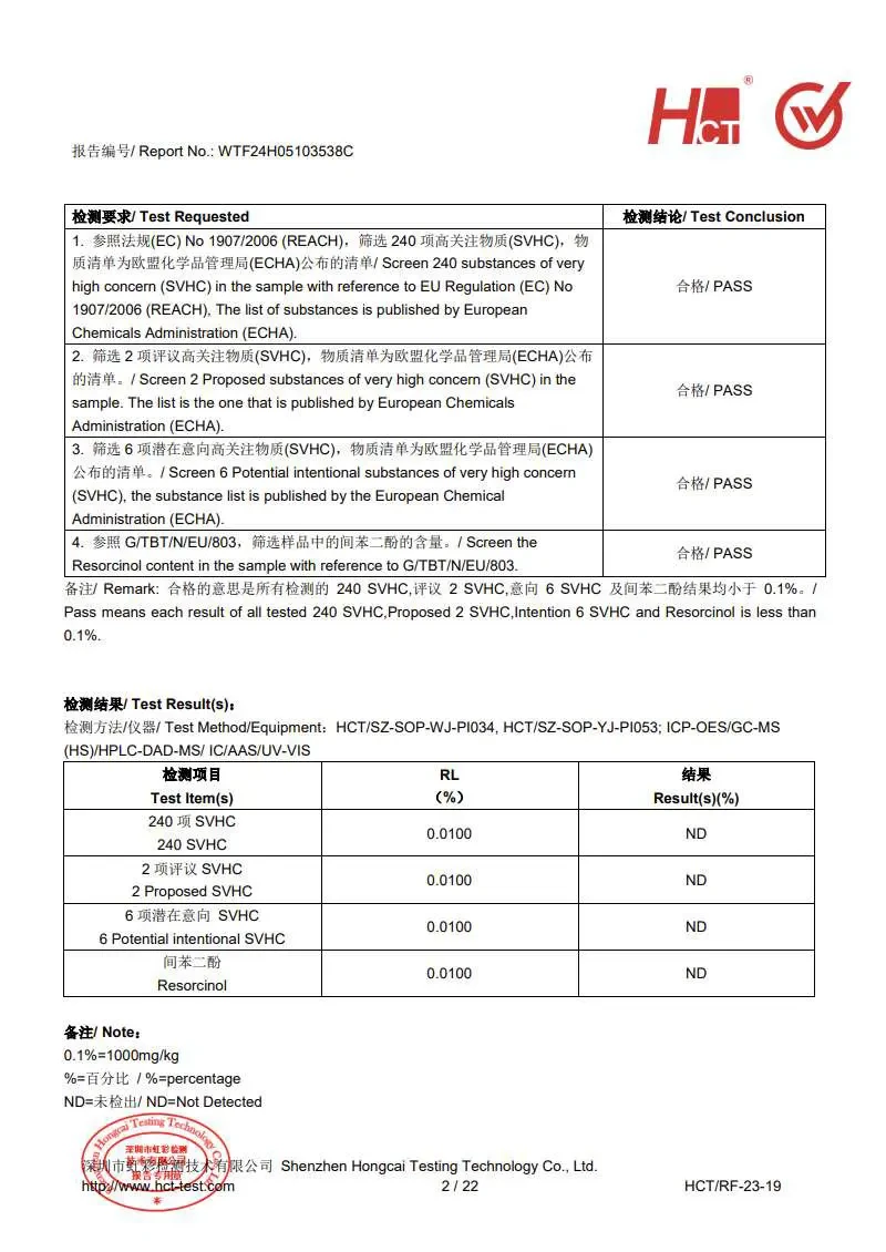 - 环保法规:符合RoHS、REACH、POPs等法规以及SVHC清单。